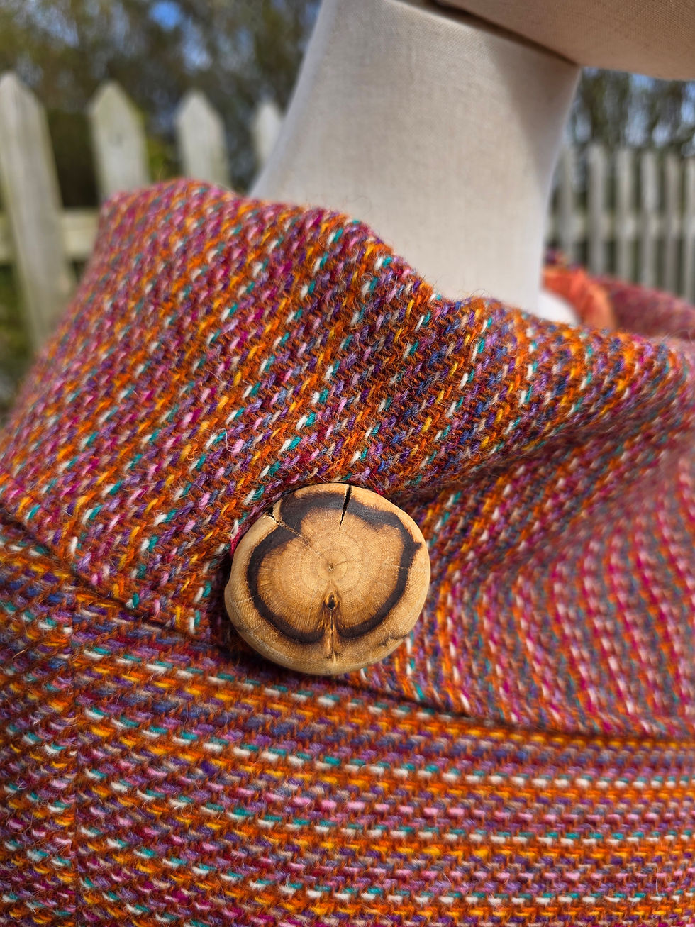 Handwoven from pure wool I create a variety of clothing from dresses to skirts, waistcoats to coats, cloaks to ponchos. Each is fully lined and made to a unique combinations of colours so each is one-of-a-kind! I am very happy to make any of my designs to order in your choice of tweed, size, buttons etc.